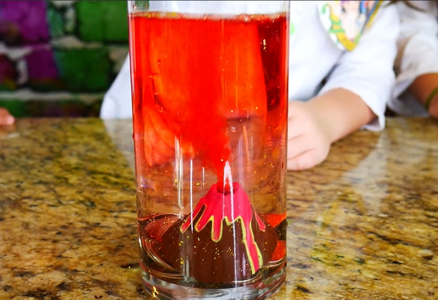 Great question! The “underwater volcano” is created because hot water rises and cold-water sinks. When we place our lava colored hot water vase into the cold water, we leave the these two forces of water no other choice but for the hot water to erupt to the top of the vase and the cold water to sink to the bottom…causing a super cool eruption!